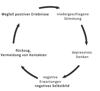 Psychotherapie hilft nachweislich bei Depressionen. Bestandteil einer wirksamen Therapie ist ganz besonders ein vertrauensvolles Verhältnis zum Therapeuten. Und es geht darum, behutsam und schrittweise den Teufelskreis aus negativen Emotionen, Gedanken und verminderter Aktivität oder aufrechterhaltenden Bedingungen aufzulösen. Wichtige Bestandteile einer hilfreichen Verhaltenstherapie können sein:- -> gemeinsam eine sinnvolle Einordnung und Erklärung für das Depressionsgeschehen zu finden